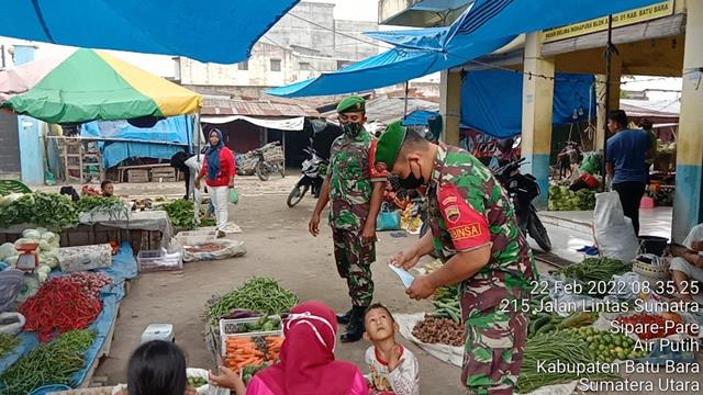 Batu Bara  |  Dalam rangka untuk memutus mata rantai penyebaran covid-19 diwilayah binaan salah satunya ditempat keramaian (Pasar Tradisional), dalam hal ini Para pedagang dan pembeli merasa senang dengan adanya himbauan dari Babinsa, seperti yang dilaukan oleh Personel Bintara Pembina Desa (Babinsa) Koramil 02/Air Putih jajaran Kodim 0208/Asahan Serma Sunardy dan Serda A. Fahmi turun kewilayah binaan untuk melaksanakan Pam Disiplin Mandiri Covid-19 di Pasar Delima Indrapura dengan menghimbau kepada para pedagang dan pembeli agar selalu mencuci tangan dgn sabun, menggunakan masker dan menjaga jarak serta menghindari kerumunan guna mencegah penularan Covid-19, kegiatan tersebut yang dilaksanakan bertempat di Pasar Delima Kelurahan Indrapura Kecamatan Air Putih Kabupaten Batu Bara, Selasa (22/02/2022).