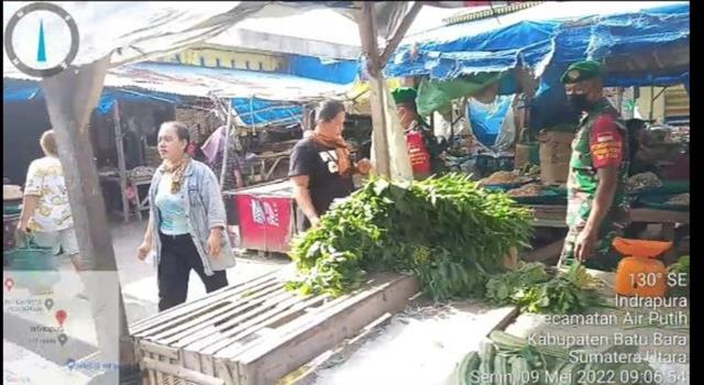 Batu Bara | Para pedagang dan pembeli merasa senang dengan adanya himbauan dari Babinsa, dalam hal ini seperti yang dilakukan oleh Personel Bintara Pembina Desa (Babinsa) Koramil 02/Air Putih jajaran Kodim 0208/Asahan Sertu Kasiadi dan Kopda Hermansyah turun kewilayah binaan untuk melaksanakan Pam Disiplin Mandiri Covid-19 di Pasar Delima Indrapura dengan menghimbau kepada para pedagang dan pembeli agar selalu mencuci tangan dgn sabun, menggunakan masker dan menjaga jarak serta menghindari kerumunan guna mencegah penularan Covid-19, kegiatan tersebut yang dilaksanakan bertempat di Pasar Delima Kelurahan Indrapura Kecamatan Air Putih Kabupaten Batu Bara, Senin (09/05/2022).