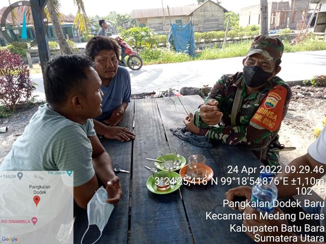 Batu Bara | Agar terjalinnya hubungan yang harmonis antara masyarakat Desa Binaan dengan Babinsa, dalam rangka menjalin silaturahmi dan membangun kekompakan bersama warga, guna memperluas jaring teritorial di wilayah binaanya, dalam hal ini seperti yang dilakukan Personel Bintara Pembina Desa (Babinsa) Koramil 01/Medang Deras jajaran Kodim 0208/Asahan Serda Muliana S turut serta melaksanakan kegiatan Komunikasi Sosial (Komsos) bersama dengan masyarakat agar semakin dekat dan menghimbau warga agar tetap memakai masker apabila keluar Rumah dalam menciptakan interaksi serta kekompakan antara babinsa dan warga binaan guna meningkatkan hubungan dengan baik sehingga kita mendapatkan informasi dengan cepat dari mitra karib tersebut bersama dengan Bapak Heriadi, Baapk Sulaiman dan Bapak P. Sinaga, kegiatan tersebut yang dilaksanakan bertempat di Kelurahan Pangkalan Dodek Baru Kecamatan Medang Deras Kabupaten Batu Bara, Minggu (24/04/2022).
