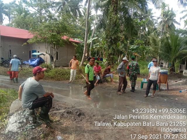 Batu Bara | Penimbunan akses jalan yang berlubang tersebut menggunakan material tanah merah, dan kayu galam karena melihat kondisi jalan rusak mengganggu kelancaran dan bisa membahayakan keselamatan pengguna jalan, seperti yang dilakukan oleh Personel Bintara Pembina Desa (Babinsa) Koramil 04/Talawi jajaran Kodim 0208/Asahan Sertu Harianto turun kewilayah binaan untuk melaksanakan kegiatan Komunikasi Sosial (Komsos) serta gotongroyong dengan aparatur desa dalam rangka agar tetap terjaganya hubungan yang baik, kegiatan tersebut yang dilaksanakan bertempat di TPU Kecamatan Talawi Kabupaten Batu Bara, Jumat (17/09/2021).