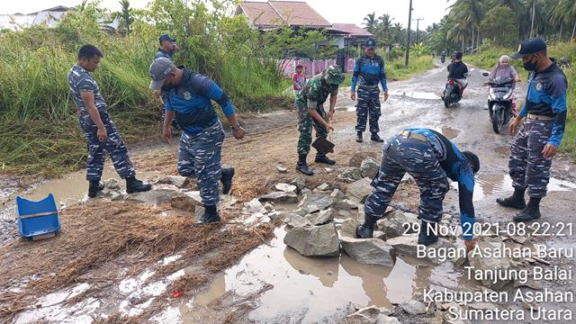 Asahan | Kerusakan jalan tersebut diperparah lagi oleh curah hujan yang cukup tinggi sehingga hampir sepanjang jalan, genangan air menghiasi jalan-jalan yang berlubang. Maka dari itu Personel Bintara Pembina Desa (Babinsa) Koramil 08/Pulau Buaya jajaran Kodim 0208/Asahan Serka Prayogi beserta 3 orang Babinsa turun kewilayah binaan untuk turut serta melaksanakan kegiatan Gotong Royong penimbunan jalan bersama dengan Mayor Laut Nabil, Personil Lanal dan Masyarakat Desa Asahan Mati, kegiatan tersebut yang dilaksanakan bertempat di Desa Asahan Mati Kecamatan Tanjung Balai Kabupaten Asahan, Senin (29/11/2021).