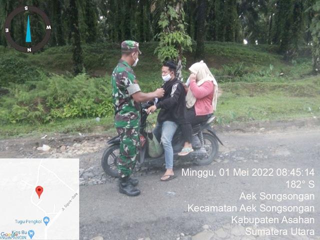 Asahan | Kesadaran masyarakat terhadap protokol kesehatan dalam rangka memutus rantai penyebaran Covid-19 masih harus ditingkatkan dan diingatkan, hal ini menjadi tugas para aparat di kewilayahan untuk terus melaksanakan sosialisasi dan aksi nyata di lapangan, seperti halnya yang dilakukan Personel Bintara Pembina Desa (Babinsa) Koramil 15/Pulau Rakyat jajaran Kodim 0208/Asahan Kopda Sutopo turun kewilayah binaan untuk melaksanakan pembagian masker kepada warga masyarakat yang sedang Melaksanakan perjalanan Mudik lebaran, adapun tujuan kegiatan ini di laksanakan agar memberi kenyamanan dan Tetap Mematuhi Protokol Covid-19 supaya terhindar dari wabah virus Covid-19 dan terhindar dari debu bersama dengan Bapak Wito, Ibu Nisma, Bapak Yadi dan Ibu patimah, kegiatan tersebut yang dilaksanakan bertempat di Jalan Lintas Sigura Gura Desa Perkebunan Bandar Pulo Kecamatan Aek Songsongan Kabupaten Asahan, Minggu (01/05/2022).