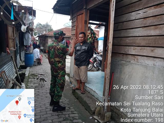 Tanjung Balai  |  Guna untuk memutus mata rantai penyebaran Virus Covid 19 serta untuk mengugah kesadaran masyarakat terhadap protokol kesehatan dalam rangka memutus rantai penyebaran covid-19 masih harus ditingkatkan dan diingatkan. Hal ini menjadi tugas para aparat di kewilayahan untuk terus melaksanakan sosialisasi dan aksi nyata di lapangan. Guna untuk memutus mata rantai penyebaran Virus Covid-19 di wilayah Binaan, Seperti halnya apa yang dilakukan oleh para Personel Koramil 17/Datuk Bandar jajaran Kodim 0208/Asahan Kopka Nurwanto turun kejalan raya untuk melaksanakan kegiatan pembagian masker kepada masyarakat dan memberikan himbauan kepada masyarakat tentang protokol kesehatan, yaitu agar selalu menggunakan masker setiap keluar rumah, cuci tangan pakai sabun dan menghindari kerumunan bersama dengan Bapak Samsul Bahri, Saudara Irwansyah dan Saudari Juliana br Dalimunte, kegiatan tersebut yang dilaksanakan bertempat di Jalan Sei Citarum Lingkungan VI Kelurahan Sumber Sari Kecamatan Sei Tualang Raso Kota Tanjung Balai, Selasa (26/04/2022).