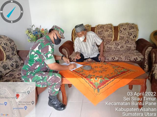 Asahan | Dalam pelaksanaan komsos tersebut Babinsa dengan meberikan himbauan kepada warga sekitar agar lebih aktif menjaga lingkungan desa, pasalnya dengan menjaga kebersihan lingkungan dengan cara tidak mencampakkan sampah sembarangan dan dapat menciptakan kawasan yang sehat bagi masyarakat sekitar, apalagi saat ini musim Pandemi Virus Corona (Covid-19), dalam hal ini Personel Bintara Pembina Desa (Babinsa) Koramil 13/Buntu Pane jajaran Kodim 0208/Asahan Serda Ponimin turun kewilayah binaan untuk melaksanakan kegiatan Komunikasi Sosial (Komsos) sekaligus Anjang sana di rumah Bapak Wanda Kadus 2B Desa Sei silau Timur sekaligus mendata warga masarakat yang belum melaksanakan Vaksin dosis 2 dan 3 karna hari Senin kita akan melaksanakan kegiatan Vaksinasi Bersama UPTD Puskesmas Prapat janji, sekaligus silaturahmi di bulan suci Ramadan ini agar terjalin hubungan Komunikasi yang humanis dan baik antara Pak Kadus dan Babinsa dalam melaksanakan kegiatan sehari-hari, keiatan tersebut yang dilaksanakan bertempat di Dusun 2B Desa Sei Silau Timur Kecamatan Buntu Pane Kabupaten Asahan, Minggu (03/04/2022).