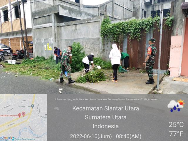 Pematang Siantar  |  Dengan dilaksanakannya kegiatan kerja bakti tersebut harapannya bisa mengurangi terjadinya banjir apabila intensitas hujan meningkat karena wilayah ini ada beberapa ruas jalan yang tergenang setiap turun hujan, dalam hal ini seperti yang dilakukan oleh Personel Bintara Pembina Desa (Babinsa) Koramil 02/Siantar Timur jajaran Kodim 0207/Simalungun Serka Supriadin, Serka B Panjaitan, Serda Sulaiman Sihombing beserta warga kelurahan pahlawan melaksanakan giat gotong royong bersama warga dalam peningkatan kebersihan di kota pematang Siantar, kegiatan tersebut yang dilaksanakan bertempat di Jalan Sutomo Kelurahan Pahlawan Kecamatan Siantar Timur Kota Pematang Siantar, Jumat (10/06/2022).