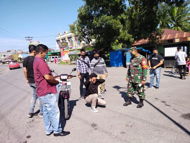 Kuala – Babinsa Koramil 04/Kuala Serda Supriadi bersama personil Polsek dan dinas kesehatan Puskesmas melaksanakan Operasi Yustisi penegakan disiplin protokol kesehatan di pos sekat simpang Duren MULO Kec. Kuala Kab. Langkat, Minggu ( 12/09/2021).