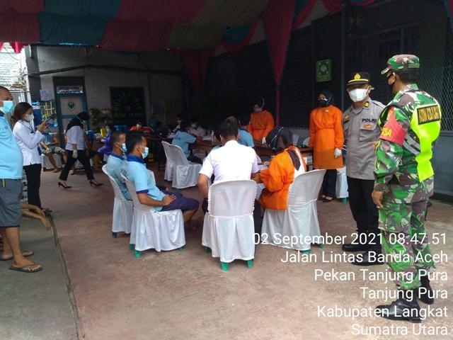 Tanjung Pura – Babinsa Koramil 11/T. Pura kodim 0203/Langkat Serda M.Syahrial bersama Bhabinkamtibmas melaksanakan kegiatan pendampingan vaksinasi masal di Lapas IIB bertempat di Kelurahan Pekan Kec. Tanjung Pura Kab. Langkat, Jumat (3/09/2021).