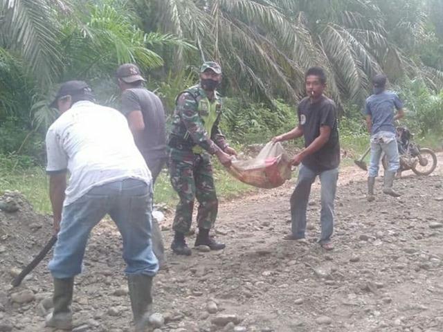 Besitang – Hancurnya jalan akibat hujan, Babinsa Koramil 14/Besitang Sertu Hasidin mengikuti gotong royong bersama warga menimbun jalan yang rusak dan berlubang bertempat di dusun Alur meranti Desa Bukit Mas Kecamatan Besitang Kabupaten Langkat, Minggu ( 12/09/2021).