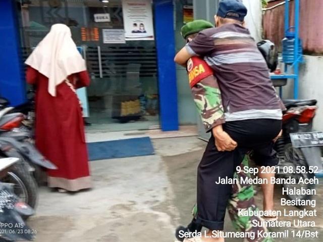 Besitang – Babinsa Koramil 14/Besitang jajaran Kodim 0203/Langkat Serda Lomo terlihat membantu warganya yang susah berjalan dgn menggendong Bpk Akhmad 48 thn untuk mengambil bantuan UMKM dikantor Bank BRI Besitang bertempat di jln. Banda Aceh Kec. Halaban Kab. Langkat, Jumat ( 10/09/2021).