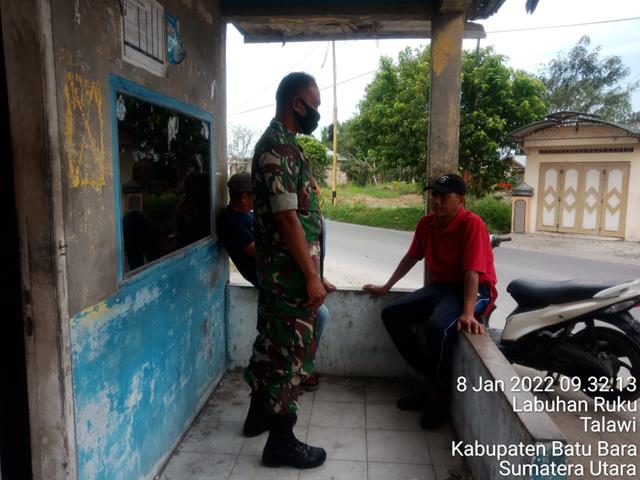 Batu Bara | Agar terjalinnya tali silaturahmi antara Babinsa dengan masyarakat, dengan adanya Komunikasi Sosial dengan mitra karib kegiatan berjalan sesuai dengan yang diharapkan dan di terima dengan baik oleh masyarakat, seperti yang dilakukan oleh Personel Bintara Pembina Desa (Babinsa) Koramil 04/Talawi jajaran Kodim 0208/Asahan Sertu N. Suprayetno dan Serda Suherman turun kewilayah binaan untuk melaksanakan kegiatan Komunikasi Sosial (Komsos) bersama dengan warga masyarakat dalam rangka Bersama Warga dan Mitra Karib sekaligus selalu mengingatkan warga agar menjalankan Prokes guna memutus mata rantai Covid-19, kegiatan Komunikasi Sosialnya tersebut yang dilaksanakan bertempat di Dusun l Desa Pahang Kecamatan Talawi Kabupaten Batu Bara, Sabtu (08/01/2022).