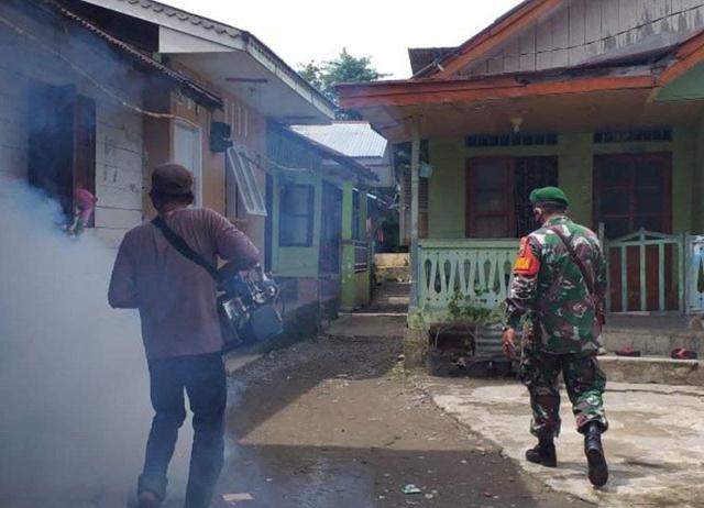 Sertu Betah eko menjelaskan kegiatan di wilayah binaannya melakukan cegah dini terhadap penyebaran penyakit demam berdarah dengan penyemprotan fogging.