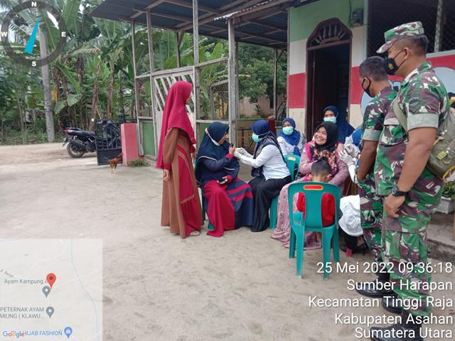 Asahan | Dalam Rangka Mendukung Kegiatan Serbuan Vaksinasi TNI dan Memutus Penularan Covid-19 pada beberapa diwilayah jajaran Kodim 0208/Asahan, seperti halnya yang dilakukan oleh Personel Bintara Pembina Desa (Babinsa) Koramil 13/Buntu Pane jajaran Kodim 0208/Asahan Serma Ismansyah, Sertu Sugito dan Serda Ponimin turun kewilayah binaan untuk melaksanakan pendampingan Serbuan Vaksin milik TNI AD Dosis l, ll dan lll kepada warga masyarakat binaan, kegiatan tersebut yang dilaksanakan bertempat di Desa Tinggi Raja Kecamatan Tinggi Raja Kabupaten Asahan, Rabu (25/05/2022).