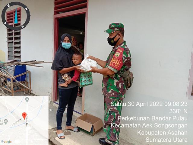 Asahan | Tanpa lelah terus terlibat dengan kegiatan desa binaannya dalam bingkisan yang dibagikan berupa uang tunai, dalam hal ini seperti yang dilakukan oleh Personel Bintara Pembina Desa (Babinsa) KoramiL 15/Bandar Pulau jajaran Kodim 0208/Asahan Kopda Juliono dan Sertu Irwan Bustomi turun kewilayah binaan untuk melaksanakan kegiatan memberikan bantuan berupa uang kepada Anak Yatim, kegiatan tersebut bentuk rasa kepedulian Babinsa dengan Anak Yatim di penghujung bulan Ramadhan, dan dengan adanya bantuan tersebut pula dapat membantu untuk kebutuhan di hari Raya A’idul fitri yang sebentar lagi telah tiba bersama dengan Bapak Sugeng (Kadus 9) dan Bapak Zamaludin (Mudin), kegiatan tersebut yang dilaksanakan bertempat di Dusun 9 Desa Batu Anam Kecamatan Rahuning Kabupaten Asahan, Sabtu (30/04/2022).