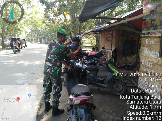 Tanjung Balai | Guna untuk memutus mata rantai penyebaran Virus Covid 19 di wilayah Binaan. Dalam hal ini Personel Bintara Pembina Desa (Babinsa) Koramil 17/Datuk Bandar jajaran Kodim 0208/Asahan Serda B.Manurung turun kewilayah desa binaan dengan melaksanakan Komunikasi Sosial (Komsos) dalam rangka untuk memeberikan himbauan kepada warga binaan tentang pentingnya mematuhi Disiplin Protokol Kesehatan serta pentingnya memakai Masker untuk menghindari penyebaran Covid-19, kegiatan tersebut yang dilaksanakan bertempat di Jalan M. Husni Thamrin Kelurahan Gading Kecamatan Datuk Bandar Kota Tanjung Balai, Jumat (11/03/2022).
