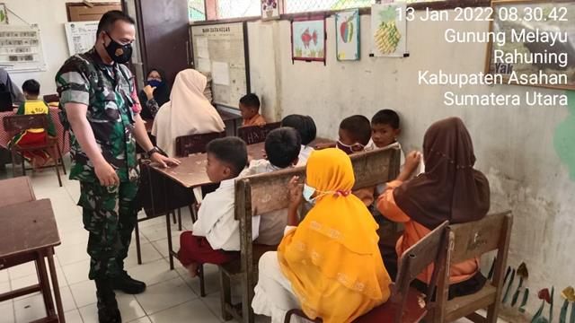 Asahan | Puluhan warga setempat antusias mengikuti vaksin, sebagai salah satu upaya pencegahan terhadap virus Covid-19, dalam hal ini Personel Bintara Pembina Desa (Babinsa) Koramil 15/Bandar Pulau jajaran Kodim 0208/Asahan Sertu Aprianto turun kewilayah binaan untuk melaksanakan kegiatan memberikan pengertian kepada siswa/siswi SD Negeri 017141 dalam rangka untuk tidak merasa takut pada saat di vaksin dan vaksin perlu untuk kekebalan tubuh kita bersama dengan Tim Vaksinator Puskesmas Rahuning, Anggota Polsek Bandar Pulau dan Siswa/Siswi SD Negeri 017141, kegiatan tersebut yang dilaksanakan bertempat di Dusun 1 Desa Perkebunan Gunung Melayu Kecamatan Rahuning Kabupaten Asahan, Kamis (13/01/2022).