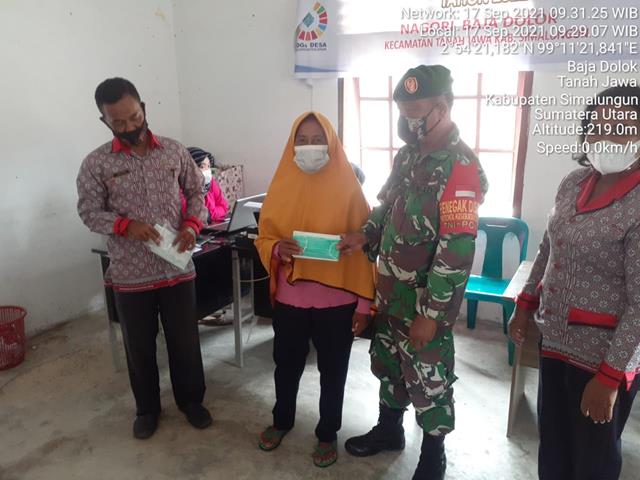 Simalungun  |  Selama penyaluran berlangsung masyarakat dengan tertib untuk mengambil bantuan dan sesuai dengan antrian yang sudah disiapkan oleh panitia penyelenggara, situasi aman dan kondusif selama pelaksanaan tidak ada kendala, dalam hal ini Personel Bintara Pembina Desa (Babinsa) Koramil 10/Balimbingan jajaran Kodim 0207/Simalungun Serda Patar Purba turun kewilayah binaan untuk melaksanakan kegiatan Pembagian BLT-DD sebanyak 10 KK, kegiatan tersebut yang dilaksanakan bertempat di Kantor Pangulu Baja Dolok Kecamatan Tanah Jawa Kabupaten Simalungun, Jumat (17/09/2021).