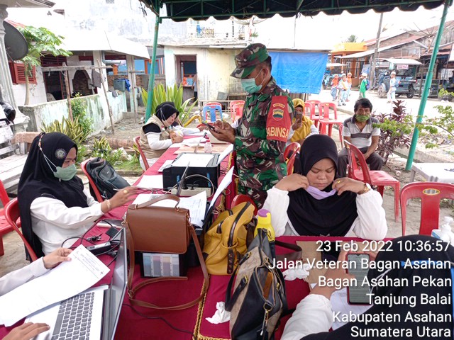 Asahan | Dalam rangka mendukung kegiatan Serbuan Vaksinasi dan memutus penularan Covid-19, dalam hal ini seperti yang dilakukan oleh Personel Bintara Pembina Desa (Babinsa) Koramil 08/Pulau Buaya jajaran Kodim 0208/Asahan Koptu M. Harahap turun kewilayah binaan untuk melaksanakan kegiatan pendampingan Vaksinasi dosis 1, 2 dan Booster demi kesehatan warga dan terhindarnya dari Covid dengan tetap mematuhi Prokes, kegiatan tersebut yang dilaksanakan bertempat di Balai Desa Bagan Pekan Asahan Kecamatan Tanjung Balai Kabupaten Asahan, Rabu (23/02/2022).