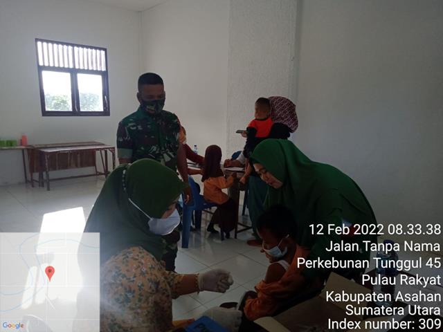 Asahan | Upaya untuk mencegah dan memutus mata rantai penyebaran covid -19 yaitu dengan vaksinasi, melalui Serbuan Vaksinasi Anak Sekolah yang dilakukan saat ini, dalam hal ini seperti yang dilaksanakan oleh Personel Bintara Pembina Desa (Babinsa) Koramil 16/Pulau Rakayat jajaran Kodim 0208/Asahan Serka Sudarmono dan Sertu M. Mahdian turun kewilayah binaannya untuk melaksanakan monitoring/pendampingan kegiatan percepatan Vaksinasi bagi masyarakat dan anak sekolah, kegiatan Vaksinasi tersebut yang dilaksanakan bertempat di Puskesmas Ofa Padang Mahondang tepatnya di Desa Tunggul 45 Kecamatan Pulau Rakyat Kabupaten Asahan, Sabtu (12/02/2022).