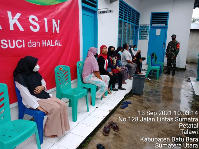 Batu Bara | Upaya untuk mencegah dan memutus mata rantai penyebaran covid -19 yaitu dengan vaksinasi, melalui Serbuan Vaksinasi TNI-Polri secara serentak kepada Purnawirawan,Warakawuri dan Keluarga Besar Tentara (KBT) serta Lansia juga masyarakat yang dilakukan saat ini dilakukan, dalam hal ini Personel Bintara Pembina Desa (Babinsa) Koramil 04/Talawi jajaran Kodim 0208/Asahan dengan kegiatan Serbuan Vaksinasi TNI di wilayah Koramil 04/Talawi yang dilaksanakan bertempat di Puskesmas Petatal Kabupaten Batu Bara, Senin (13/09/2021).