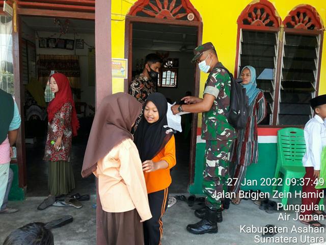 Asahan | Upaya untuk mencegah dan memutus mata rantai penyebaran covid -19 yaitu dengan vaksinasi, melalui Serbuan Vaksinasi TNI-Polri secara serentak kepada Anak Sekolah yang dilakukan saat ini, dalam hal ini Personel Bintara Pembina Desa (Babinsa) Koramil 07/Air Joman jajaran Kodim 0208/Asahan Serda Hadi Ismanto dan Serda Ali Imron turun kewilayah binaannya untuk melaksanakan monitoring/pendampingan kegiatan percepatan Vaksinasi bagi masyarakat terutama anak SD sederajat (Usia 6-11 th) Dosis-1 & warga masyarakat Dosis-I & II, Jenis Sinovac, Astrazeneca, Pfizer (Vaksin Dinkes) di wil Koramil 07/Air Joman, kegiatan Vaksinasi tersebut yang dilaksanakan bertempat di SD Negeri 010244 di Dusun-V Desa Punggulan Kecamatan Air Joman dan Dusun-II Desa Silo Lams Kecamatan Silau Laut Kabupaten Asahan, Kamis (27/01/2022).
