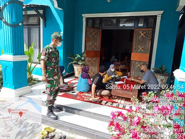 Tanjung Balai | Kegiatan vaksinasi yang digelar di wilayah Baimbingan, sebelum warga masyarakat melaksanakan Vaksinasi ada beberapa tahapan yang dilakukan oleh team medis, pertama didata, diperiksa tensi, suhu tubuh, dilanjut screning dan penyuntikan vaksin, dalam hal ini seperti yang dilakukan ileh Personel Bintara Pembina Desa (Babinsa) Koramil 17/Datuk Bandar jajaran Kodim 0208/Asahan Kopka JA Simanungkalit turun kewilayah binaan untuk melaksanakan kegiatan pendampingan kegiatan penyuntikan Vaksin Covid-19 terhadap warga desa binaan dengan secara door to door, bersama dengan para Babhinkabtibmas Se-Kecamatan Datuk Bandar Timur, Para Kepling Pulo Simardan dan Nakes 10 orang, kegiatan tersebut yang dilaksanakan bertempat di Rumah Ibu Yus tepatnya di Jalan Kurnia Lingkungan IX Kelurahan Pulo Simardan Kecamatan Datuk Bandar Timur Kota Tanjung Balai, Sabtu (05/03/2022).