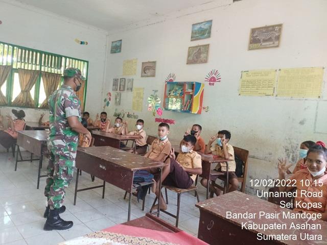 Asahan | Dalam hal ini pada kegiatan ini merupakan kegiatan rutinitas aparat Komando Kewilayahan, guna meningkatkan hubungan harmonisasi antara aparat teritorial yakni sebagai Babinsa terhadap aparat desa binaannya, agar terjalin hubungan yang baik dengan cara komunikasi sosial. Seperti yang dilakukan oleh Personel BIntara Pembina Desa (Babinsa) Koramil 14/Bandar Pasir Mandoge jajaran Kodim 0208/Asahan Serda Sudarman turun kewilayah binaan untuk melaksanakan kegiatan Komunikasi Sosial (Komsos) bersama dengan Guru wali kelas Vl Ibu Ibu.Farida Br.Siadari SPG dan Anak murid SD Kelas Vl membahas masalah Perkembangan Vaksinasi serta memberikan himbauan/pengarahan kepada anak anak murid SD N.017123 yang belum di Vaksin, kegiatan tersebut yang dilaksanakan bertempat di Dusun V Desa Se Kopas Kecamatan Bandar Pasir Mandoge Kabupaten Asahan, Sabtu (12/02/2022).