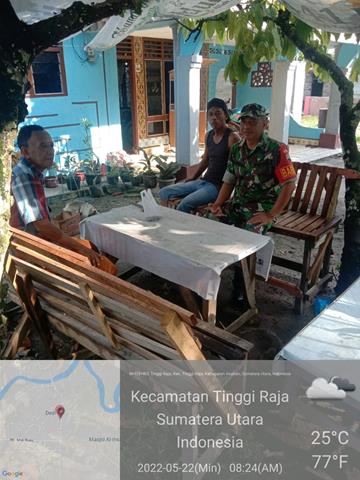 Asahan  |  Agar Terjalinnya hubungan yang harmonis antara Masyarakat Penjual Boneka Desa Sei Jawi jawi dengan Babinsa, Komsos dengan warga desa akan meningkatkan kerja sama antara Babinsa dan Masyarakat Desa untuk menciptakan keakraban, kerukunan dan keamanan di lingkungan. Selain itu, kegiatan ini lebih efektif karena bisa saling tukar menukar informasi, sehingga nantinya warga dapat memperoleh informasi dan mengetahui permasalahan-permasalahan yang dihadapi saat ini. Seperti yang dilakukan oleh Personel Bintara Pembina Desa Koramil 13/Buntu pane jajaran Kodim 0208/Asahan Serda M. Sagala turun kewilayah desa binaan untuk melaksanakan Komuniukasi Sosial (Komsos) bersama dengan Mitra Karib warga desa binaan Bapak Sugianto Tomas desa Tinggi raja membahas Aktivitas/Kegiatan masyarakat Setelah Hari Raya, sekaligus menghimbau agar untuk selalu mematuhi protokol kesehatan, kegiatan tersebut yang dilaksanakan bertempat di warung Bapak Darwin tepatnya berposisi di Dusun 7 Desa Tinggi Raja Kecamatan Tinggi Raja Kabupaten Asahan, Minggu (22/05/2022).