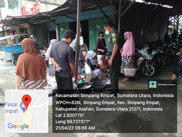 Dalam hal ini seperti yang dilakukan oleh Personel Bintara Pembina Desa (Babinsa) Koramil 11/Simapng Empat jajaran Kodim 0208/Asahan Serka Sutarno turun kewilayah binaan untuk melaksanakan kegiatan Komunikasi Sosial (Komsos) bersama dengan Saudara Nano pedagang ikan dan cabai, bawang, telur ayam dll, dalam rangka mengatakan harga ikan laut saat ini masih normal , cabai rawit turun dari Rp 50.000/kg nya sekarang sudah Rp 25.000/kg nya, harga ikan laut stabil, dan sebagian harga kebutuhan pokok lainnya masih stabil, Babinsa memberikan himbauan kepada masyarakat dan pedagang untuk tetap mematuhi protokol Kesehatan baik pembeli maupun yang berjualan, dalam rangka memutus mata rantai penyebaran Covid 19, kegiatan tersebut yang dilaksanakan bertempat di Desa Simpang Empat Kecamatan Simpang Empat Kabupaten Asahan, Kamis (21/04/2022).