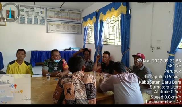 Dalam hal ini seperti yang dilakukan oleh Personel Bintara Pembina Desa Koramil 03/Lima Puluh jajaran Kodim 0208/Asahan Serda Sutikno turun kewilayah desa binaan untuk melaksanakan Komunikasi Sosial (Komsos) bersama dengan Sekdes Bapak Hendra, Kadus 3, Kadus 6, Kadus 9 dan Masyarakat Desa Perupuk agar mengaktifkan kembali siskamling di desa dan menjaga kebersihan lingkungan guna mencegah dan mengurangi tindak pencurian dan lingkungan sekitar merasa aman dan nyaman serta meningkatkan keamanan lingkungan dengan menertibkan kembali tentang pelaksanaan jaga siskamling serta membicarakan tentang perkembangan situasi dan kondisi perekonomian yang semakin sulit, juga untuk keamanan serta dalam rangka untuk mempererat silaturrahmi di desa binaan, kegiatan tersebut yang dilaksanakan bertempat di Desa Perupuk Kecamatan Lima Puluh Pesisir Kabupaten Batu Bara, Selasa (29/03/2022).