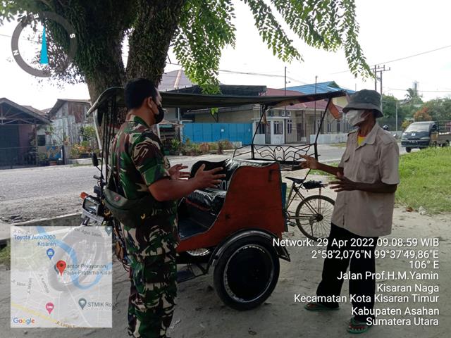 Asahan | Agar Terjalinnya hubungan yang harmonis antara Masyarakat Tukang Betor Warga Binaan dengan Babinsa, Komsos dengan warga desa akan meningkatkan kerja sama antara Babinsa dan Masyarakat Desa untuk menciptakan keakraban, kerukunan dan keamanan di lingkungan. Dalam hal ini seperti yang dilakukan oleh Personel Bintara Pembina Desa Koramil 06/Kisaran jajaran Kodim 0208/Asahan Serda Kamaluddin turun kewilayah desa binaan untuk melaksanakan Komuniukasi Sosial (Komsos) bersama dengan warga desa binaan tentang keamanan berkendara bersama tukang Betor a.n Bapak Tukijo, Usia 47 Tahun dan Bapak Marlan, sekaligus menghimbau agar untuk selalu mematuhi protokol kesehatan, kegiatan tersebut yang dilaksanakan bertempat di warung Bapak Darwin tepatnya berposisi di Jalan Prof M. Yamin Kelurahan Kisaran Naga Kecamatan Kistim Kabupaten Asahan, Jumat (29/04/2022).