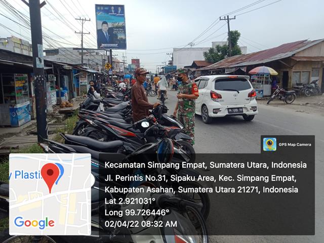 Asahan  |  secara rutin dan berkesinambungan harus melaksanakan Komunikasi Sosial (Komsos) dengan masyarakat di wilayah binaannya, dalam hal ini seperti yang dilakukan oleh Personel Bintara Pembina Desa (Babinsa) Koramil 11/Simpang Empat jajaran Kodim 0208/Asahan Serka Adi S Sirait turun kewilayah binaan untuk melakanakan kegiatan Komsos dengan Bapak Andi Ginting yakni tukang parkir di Pasar tradisional Simpang Empat, kegiatan tersebut yang dilaksanakan bertempat di Pasar Tradisional Simpang Empat Kecamatan Simpang Empat Kabupaten Asahan, Sabtu (02/04/2022).