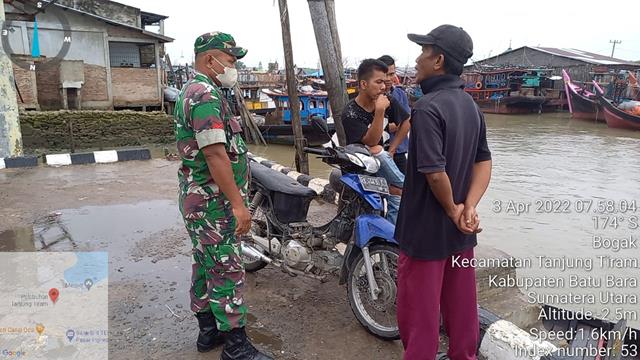 Batu Bara | Dalam rangka untuk menciptakan Kerjasama yang baik bersama mitra karib dan Babinsa agar dapat membantu dan mendukung tugas Apter diwilayah binaannya. Seperti halnya yang dilakukan oleh Personel Bintara Pembina Desa (Babinsa) Koramil 05/Tanjung Tiram jajaran Kodim 0208/Asahan Kopka Basiyran turun kewilayah desa binaan untuk melaksanakan Komunikasi Sosial (Komsos) bersama dengan Masyarakat Desa Tanjung Tiram pelabuan sekaligus mengingatkan masyarakat Desa Tanjung Tiram yang sedang melaksanakan aktivitas sehari-hari agar selalu mematuhi protokol kesehatan. jaga jarak dan memakai masker, agar terhindar dari penularan Covid-19 bersama dengan Bapak Salan, Bapak Musa dan Saudara Badri, kegiatan tersebut yang dilaksanakan bertempat di Dea Tanjung Tiram Kecamatan Tanjung Tiram Kabupaten Batu Bara, Minggu (03/04/2022).