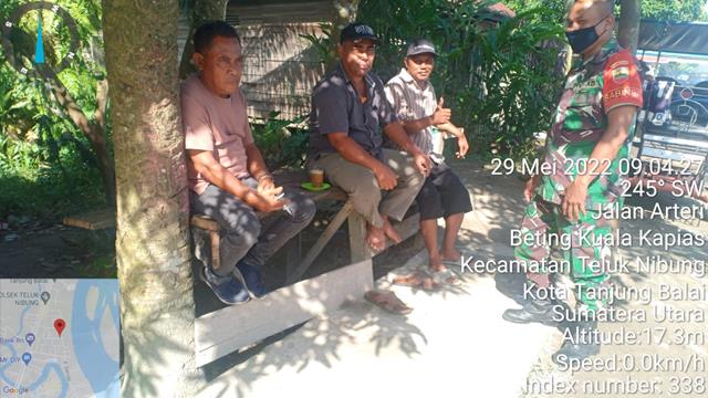 Tanjung Balai | Dalam rangka untuk membangun Komunikasi Sosial dengan seluruh masyarakat terus di lakukan Babinsa, untuk mewujudkan kemanunggalan TNI dan Rakyat, dalam hal ini seperti yang dilakukan oleh Personel Bintara Pembina Desa (Babinsa) Koramil 08/Pulau Buaya jajaran Kodim 0208/Asahan Sertu Fauzi Nasution turun kewilayah binaan untuk melaksanakan kegiatan Komunikasi Sosial (Komsos) bersama wargabinaan sebagai Nelayan untuk selalu semangat bekerja dengan tetap menjaga kebersihan dan kesehatan, bersama dengan Bapak Amin, Bapak Rustam, Bapak Muhammad dan Bapak Zulkifli, kegiatan tersebut yang dilaksanakan bertempat di Jalan Arteri Kelurahan Beting Kuala Kapias Kecamatan Teluk Nibung Kota Tanjung Balai, Minggu (29/05/2022).
