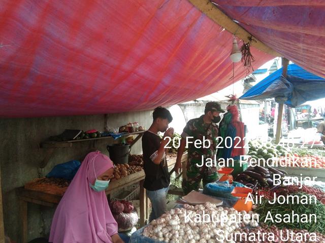 Asahan  |  Komunikasi sosial ini di harapkan dapat menambah dan meningkatkan jalinan komunikasi yang harus selalu di bina dan di tingkatkan oleh seorang Babinsa di wilayah agar dengan mudah mendapatkan informasi yang akurat dari siapapun tak kecuali para pedagang sayuran. Seperti halnya yang dilakukan oleh Personel Bintara Pembina Desa (Babinsa) Koramil 07/Air Joman jajaran Kodim 0208/Asahan Serda Irsan Siregar turun kewilayah binaan untuk melaksanakan kegiatan Komunikasi Sosial (Komsos) dengan para pedagang sayur mayur di pasar pagi Binjai serbangan, Komsos bertujuan disamping saling tukar informasi seputar harga sembako khusus sayur dan rempah juga sekaligus menghimbau agar pedagang pasar juga tetap melaksanakan prokes diantaranya selalu memakai masker guna memutus penyebaran wabah covid-19 bersama dengan Ibu Siti Aminah (Pedagang pasar) dan Alamsyah (Pedagang pasar), kegiatan tersebut yang dilakukan bertempat di Kelurahan Binjai Serbangan Kecamatan Air Joman Kabupaten Asahan, Minggu (20/02/2022).
