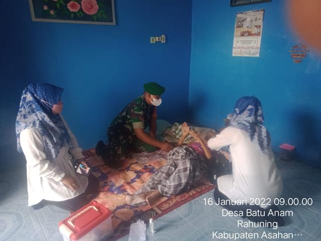 Asahan | Sebagai bentuk peduli asih dan menjalin silaturrahmi terhadap warga desa binaan, Pelaksanaan Komsos merupakan tugas rutin yang dilaksanakan Babinsa untuk mengetahui perkembangan wilayah binaan serta sebagai sarana mempererat hubungan antara TNI dan Masyarakat. Seperti halnya yang dilakukan oleh Personel Bintara Pembina Desa (Babinsa) Koramil 15/Bandar Pulau jajaran Kodim 0208/Asahan Kopda Juliono turun kewilayah binaan untuk melaksanakan kegiatan mendampingi pihak puskesmas mendatangi rumah warga desa binaan yang mengalami sakit, kegiatan ini dilakukan bersama dengan Ibu Dewi (Bidan Desa), Ibu Sridati (Tenaga Kesehatan) dan Ibu Poniem (Pasien), kegiatan tersebut yang dilaksanakan bertempat di Dusun 4 Desa Batu Anam Kecamatan Rahuning Kabupaten Asahan, Minggu (16/01/2022).