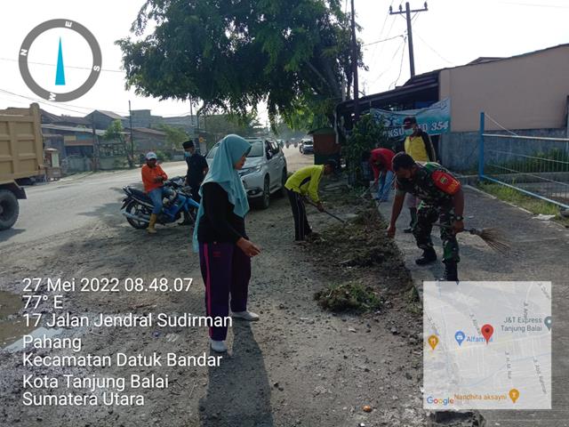 Tanjung Balai | Walaupun ditengah masa Pandemi Covid-19 tak menyurutkan semangat Personel Babinsa Koramil 17/Datuk Bandar jajaran Kodim 0208/Asahan Koptu Ruswandy turun kewilayah desa binaan untuk melaksanakan kegiatan Gotong-royong bersama dengan Camat Datuk Bandar Bapak Abu Said Lubis S,Ag, Seklur Pahang Ibu Yuli, Kepling Pahang dan Kepling Pantai Johor serta Masyarakat setempat dengan maksud dan tujuan giat tersebut untuk merapikan ranting-ranting pohon dan membersihkan badan jalan agar terlihat bersih, kegiatan tersebut yang dilaksanakan bertempat di Jalan Jenderal Sudirman Kelurahan Pahang Kecamatan Datuk Bandar Kota Tanjung Balai, Jumat (27/05/2022).