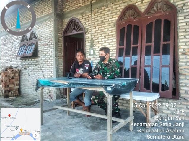 Asahan  |  Menjalin hubungan silaturahmi diwilayah binaan sangat penting dilakukan oleh aparat kewilayahan, seperti yang dilakukan oleh Personel Bintara Pembina Desa (Babinsa) Koramil 13/Buntu Pane jajaran Kodim 0208/Asahan Serda Jasem turun kewilayah binaan untuk melaksanakan kegiatan Komunikasi Sosial (Komsos) dan  Silaturahmi Kepada Tokoh Pemuda Desa Bangun Sari Bapak Imran dengan Tujuan memper erat Hubungan Tali Silaturrahmi Dengan Babinsa dan guna menjalin silaturahmi dengan masyarakat sehingga dapat cepat mendapat informasi  tentang perkembangan situasi desa serta Memeberikan pemahaman Protokol Covid-19, kegiatan Komsosnya tersebut yang dilaksanakan bertempat di Dusun 2 Desa Bangun Sari Kecamatan Setia Janji Kabupaten Asahan, Jumat (15/04/2022).