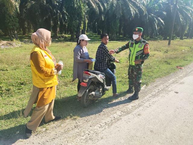 Padang Tualang – Babinsa Koramil 10/Padang tualang Kodim 0203/Langkat Praka Syahruddin bersama tim relawan melaksanakan kegiatan pembagian masker gratis kepada warga yang melintas bertempat di jalan besar Batang serangan Dusun Titi belangah Desa Sei bamban Kecamatan Batang serangan Kab. Langkat, Senin (30/08/2021).