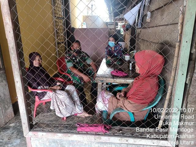 Asahan  |  Guna untuk memutus mata rantai penyebaran Virus Covid 19 di wilayah Binaan, dalam hal ini seperti yang dilakukan oleh Personel Bintara Pembina Desa (Babinsa) Koramil 14/Bandar Pasir Mandoge jajaran Kodim 0208/Asahan Serda Sudarman turun kewilayah binaan untuk melaksanakan kegiatan Komunikasi Sosial (Komsos) untuk memberikan himbauan khususnya yang Lansia yang belum di Vaksin serta melaksanakan pengawasan protokol covid-19 dan pemberian masker kepada masyarakat, dengan memberikan pemahaman New Normal yaitu menggunakan masker setiap keluar rumah, cuci tangan pakai sabun, menjaga jarak, menghindari kerumunan serta pembagian masker bersama dengan Bides Ibu Dorti Br. Sirait, Ibu Samini dan Ibu Maulina Br. Siregar, kegiatan tersebut yang dilaksanakan bertempat di Dusun Vlll Desa Suka Makmur Kecamatan Bandar Pasir Mandoge Kabupaten Asahan, Kamis (10/02/2022).