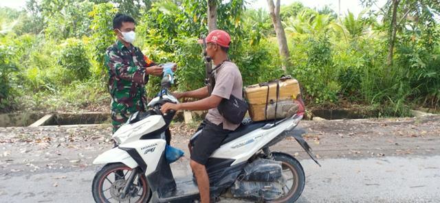 Selain melaksanakan pengawasan dan monitoring PPKM mikro, Babinsa dan petugas juga membagikan masker kepada warga yang kedapatan beraktivitas diluar rumah dan masih belum memiliki masker / tidak menggunakan masker. Melalui kegiatan ini, diharapkan dapat menggugah kesadaran masyarakat untuk selalu patuh dalam menerapkan protokol kesehatan serta patuh pada masa pembatasan kegiatan masyarakat (PPKM).