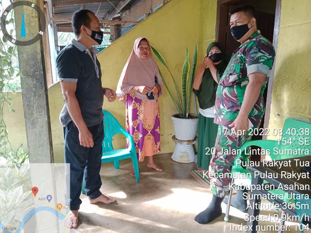 Asahan | Dalam rangka agar terjalinnya Tali Silahturahmi Antara Babinsa dan Warga Binaan Serta Mengajak Masyarakat Agar melaksanakan Vaksin lanjutan ke 3 (Booster) serta agar Masyarakat selalu menjaga kesehatan guna memutus penyebaran mata rantai Virus Corona (Covid-19), dalam hal ini Personel Bintara Pembinsa Desa (Babinsa) Koramil 16/Pulau Rakayat jajaran Kodim 0208/Asahan Serka Sahrul dan satu orang anggota turun kewilayah binaan untuk melaksanakan Komunikasi Sosial (Komsos) bersaam dengan warga masyarakat desa binaan dalam rangka untuk menghimbau agar Selalu mematuhi protokol kesehatan dengan Cara menggunakan masker dalam menjalankan Aktivitas sehari hari bersama dengan Ibu Fatimah (Warga), Ibu Dewi Ratna (warga), Ibu Khodijah Hasibuan (warga) dan Ibu Marniati (Warga), sekaligus menghimbau dalam rangka Pendisiplinan Adaptasi kebiasaan baru dan dalam rangka mencegah Penyebaran Pandemi Virus Corona (Covid-19) kepada Warga Desa Binaan serta memberikan Masker dan Membicarakan tentang Rencana pelaksanaan Vaksinasi yang akan di laksanakan dan jangan lupa makan pagi terlebih dahulu sebelum di vaksin, kegiatan tersebut yang dilaksanakan bertempat di Dusun I Desa Pulau Rakyat Tua Kecamatan Pulau Rakyat Kabupaten Asahan, Minggu (17/04/2022).