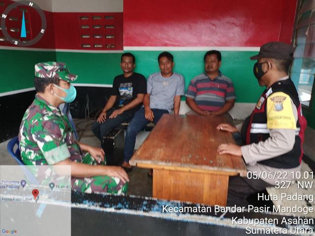 Asahan | Untuk menciptakan dan meningkatkan kerja sama yang baik, dan menjaga silatuhrahmi antara TNI dan masyarakat, untuk menciptakan kemanunggalan TNI dan Rakyat serta dalam rangka agar terjalinnya tali silaturahmi dan hubungan yang harmonis antara Babinsa dengan masyarakat diwilayah desa binaan, seperti yang dilakukan oleh Personel Bintara Pembina Desa (Babinsa) Koramil 14/Bandar Pasir Mandoge jajaran Kodim 0208/Asahan Serda Joni Tanjung bersama Mitra Karib melaksanakan Komsos guna mempererat hubungan Keharmonisan dan kebersamaan dalam Sinergeritas antara TNI- POLRI bersama rakyat, bersama dengan Babinkamtibmas Aipda Jui Manurung, Bapak Indra Saputra, Bapak Bayu Handoko, Bapak Farhan Lubis dan Bapak Syaiful Ritonga, kegiatan tersebut yang dilaksanakan bertempat di Dusun Vll Desa Huta Padang Kecamatan Bandar Pasir Mandoge Kabupaten Asahan, Minggu (05/06/2022).