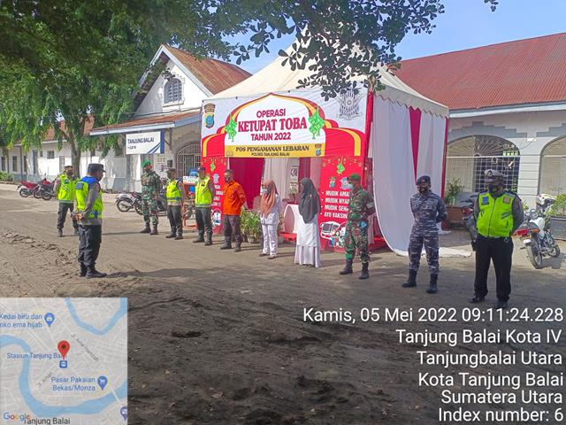 Tanjung Balai | Dalam rangka agar terciptanya kerjasama antara TNI POLRI dan Intansi terkait dalam pengamanan penumpang Kereta Api serta penerapan protokol kesehatan bagi masyarakat yang melaksanakan liburan Idul Fitri guna meningkatkan keamanan selama perayaan Hari Raya Idul Fitri, dalam kesempatan ini seperti yang dilakukan oleh Personel Bintara Pembina Desa (Babinsa) Koramil 08/Pulau Buaya jajaran Kodim 0208/Asahan Serma Hendra Hadi Pranata dan Pratu Padli turun kewilayah binaan untuk melaksanakan Pengamanan Operasi Pos Pam III Lebaran Idul Fitri 1443 H Ops Ketupat Thn 2022 dan pendampingan vaksinasi Covid-19, kegiatan tersebut yang dilaksanakan bertempat di Pos PAM II Jalinsum Medan-Rantau Prapat KM 261-217 tepatnya di Stasiun K.A. Jalan Letjend Suprapto Kota Tanjung Balai, Kamis (05/05/2022).