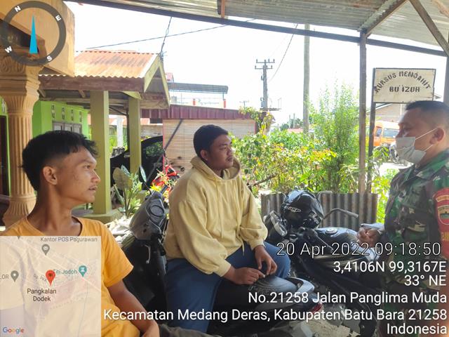 Batu Bara | Dalam rangka untuk menciptakan dan meningkatkan kerja sama yang baik, dan menjaga silatuhrahmi antara TNI dengan masyarakat, untuk menciptakan kemanunggalan TNI dengan Rakyat, agar terjalinnya tali silaturahmi dan hubungan yang harmonis antara Babinsa dengan masyarakat Desa binaan, seperti yang dilakukan oleh Personel Bintara Pembina Desa (Babinsa) Koramil 01/Medang Deras jajaran Kodim 0208/Asahan Sertu Saut turun kewilayah desa binaan untuk melaksanakan kegiatan Komunikasi Sosial (Komsos) bersama dengan masyarakat Desa binaan dan selalu menghimbau agar tetap mematuhi Protokol Kesehatan bersama dengan Bapak Ruslan Tokoh Pemuda dan Bapak Heri, kegiatan tersebut yang dilaksanakan bertempat di Kelurahan Pangkalan Dodek Baru Kecamatan Medang Deras Kabupaten Batu Bara, Rabu (20/04/2022).