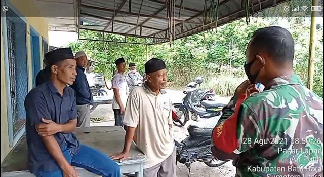 Batu Bara | Agar masyarakat dan TNI dapat berbaur dan tegur sapa,serta terjalin nya kerja sama yang baik antara TNI-Rakyat dibulan suci ramadhan serta untuk menjalin hubungan silaturahmi yang lebih baik antara Babinsa dengan Masyarakat dengan tidak melupakan Protokol kesehatan guna memutus penyebaran Covid 19. Seperti yang dilakukan oleh Personel Bintara Pembina Desa (Babinsa) Koramil 02/Air Putih jajaran Kodim 0208/Asahan Sertu Ady Sutrisno turun kewilayah binaan untuk melaksanakan Komunikasi Sosial (Komsos) bersama dengan warga membahas untuk menjaga kesehatan pribadi dan keluarganya dan untuk selalu mentaati Protokol kesehatan bersama dengan Kadus Ladang Lawas Bapak Suryani, Tokoh masyarakat Bapak Husin dan masyarakat Desa Pasar Lapan, kegiatan tersebut yang dilaksanakan bertempat di Dusun Ladang Baru Desa Pasar Lapan Kecamatan Air Putih Kabupaten Batu Bara, Sabtu (28/08/2021).