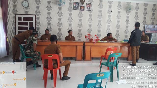 Asahan | Dalam rangka meningkatkan kerja sama yang baik dalam mendukung tugas pokoknya sebagai Bintara Pembina Desa, dalam hal ini seperti yang dilakukan oleh Personel Bintara Pembina Desa (Babinsa) Koramil 07/Air Joman jajaran Kodim 0208/Asahan Serka Joni Iwan Priono turun kewilayah binaan untuk melaksanakan kegiatan Komunikasi Sosial (Komsos) bersama dengan Perangkat Desa dalam rangka untuk sekaligus berkoordinasi tentang Kamtibmas dan kegiatan-kegiatan lainnya menjelang dan selama bulan suci Ramadhan 1444 H/Tahun 2022 bersama dengan Sekdes (Bapak Fauzi), Kaur Kesra (Bapak Rudi), Staf Desa (Bapak Dedi) dan Para Kepala Dusun 1 sd 8 Desa Air Joman, kegiatan tersebut yang dilaksanakan bertempat di Balai Desa Air Joman Kecamatan Air Joman Kabupaten Asahan, Senin (28/03/2022).