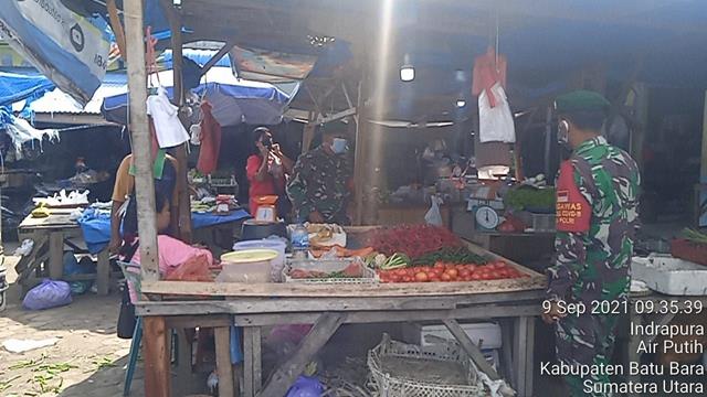 Batu Bara | Batu Bara | Dengan melaksanakan Pam Disiplin Mandiri Covid-19 di Pasar Delima Indrapura dengan menghimbau kepada para pedagang dan pembeli agar selalu mencuci tangan dgn sabun, menggunakan masker dan menjaga jarak serta menghindari kerumunan guna mencegah penularan Covid-19, seperti yang dilakukan oleh Personel Bintara Pembina Desa (Babinsa) Koramil 02/Air Putih jajaran Kodim 0208/Asahan Peltu Budi. S dan Sertu Kasiadi turun kewilayah binaan untuk Pam Disiplin Mandiri Covid-19 di Pasar Delima Indrapura dengan menghimbau kepada para pedagang dan pembeli agar selalu menggunakan masker dan menjaga jarak serta menghindari kerumunan guna mencegah penularan Covid-19. Giat tersebut berlokasi di Pasar Delima, Kelurahan Indrapura, Kecamatan Air Putih, Kabupaten Batu Bara, Kamis (09/09/2021).