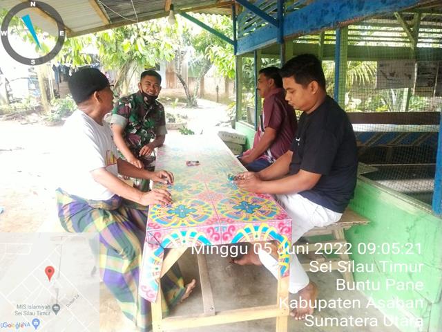 Asahan | Kegiatan interaksi secara langsung dengan masyarakat di Desa Binaan, merupakan salah satu bagian tugas Babinsa di bidang binter. Seperti yang dilakukan oleh Personel Bintara Pembina Desa (Babinsa) Koramil 13/Buntu Pane jajaran Kodim 0208/Asahan Sertu Toni Suwandi bersama Masyarakat melaksanakan Komsos untuk menjalin hubungan tali Silahturahmi yang baik dan Keharmonisan dalam menunjang tugas pokok selaku Babinsa diwilayah binaan, bersama dengan Kadus ll B Bapak Wanda, Bapak Rudianto dan Bapak Wagimin, kegiatan tersebut yang dilaksanakan bertempat di Dusun ll B Desa Sei Silau Timur Kecamatan Buntu Pane Kabupaten Asahan, Minggu (05/06/2022).