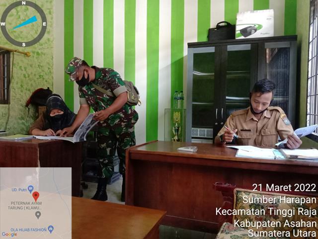 Asahan | Guna mengetahui perkembangan di wilayah binaan dan dengan mendata masyarakat yang masuk wilayah Desa binaan tanpa melaporkan keberadaannya, dalam hal ini seperti yang dilakukan oleh Personel Bintara Pembina Desa (Babinsa) Koramil 13/Buntu Pane jajaran Kodim 0208/Asahan Serda Ponimin turun kewilayah binaan untuk melaksanakan kegiatan Komunikasi Sosial (Komsos) bersama dengan Sekretaris Desa Bapak Dani dan Kaur Desa Ibu Indah dalam rangka untuk melaksanakan kegiatan mengetahui situasi daerah mana yang rawan bencana dapat di cegah dan cepat penanganannya jika terjadi musibah atau bencana longsor dan gempa bumi.apalagi pada saat situasi Cuaca mengalami panca roba. agar warga masyarakat dapat tanggap dan peka terhadap situasi yang terjadi dan tetap menjaga kesehatan dan keluarga khususnya, kegiatan tersebut yang dilaksanakan bertempat di Kantor Desa Sumber harapan Kecamatan Tinggi Raja Batu Kabupaten Asahan, Senin (21/03/2022).