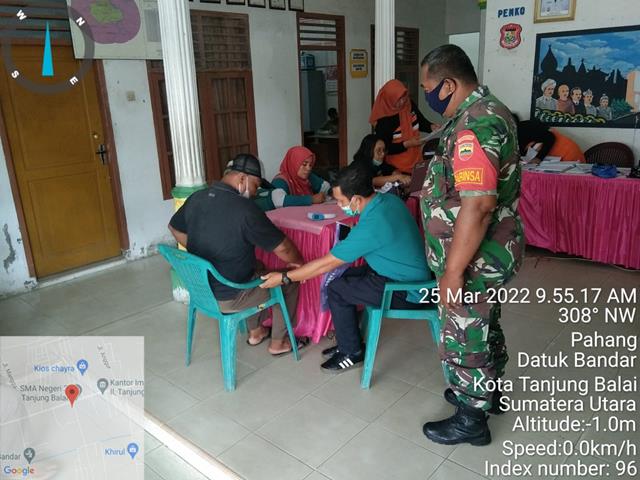 Tanjung Balai  |  Dalam rangka mendukung kegiatan Serbuan Vaksinasi dan memutus penularan Covid-19, serta agar Masyarakat selalu menjaga kesehatan guna memutus penyebaran mata rantai Virus Corona (Covid-19). Dalam hal ini seperti yang dilakukan oleh Personel Bintara Pembina Desa (Babinsa) Koramil 17/Datuk Bandar jajaran Kodim 0208/Asahan Pelda Herianto turun kewilayah binaan untuk melaksanakan kegiatan pendampingan Vaksinasi dari Bin yang dilaksanakan Tim Nakes dari Puskesmas bagi Warga Masyarakat Desa Binaan sekaligus memberikan Masker bagi yang tidak memakai masker, kegiatan tersebut yang dilaksanakan bertempat di Aula Kantor Camat Jalan Jenderal Sudirman Lingkungan III Kelurahan Pahang Kecamatan Datuk Bandar Kota Tanjung Balai, Jumat (25/03/2022).